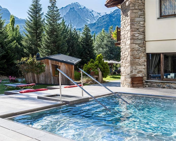 Dans le jardin, le bassin principal et le sauna chalet extérieur offrent une vue imprenable sur le Mont Blanc pour profiter de la détente sans renoncer au panorama.